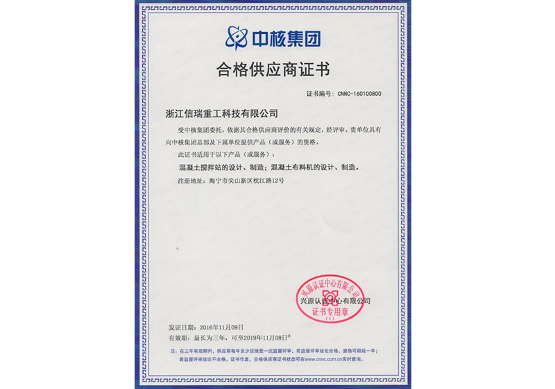 中核合格供應商證書